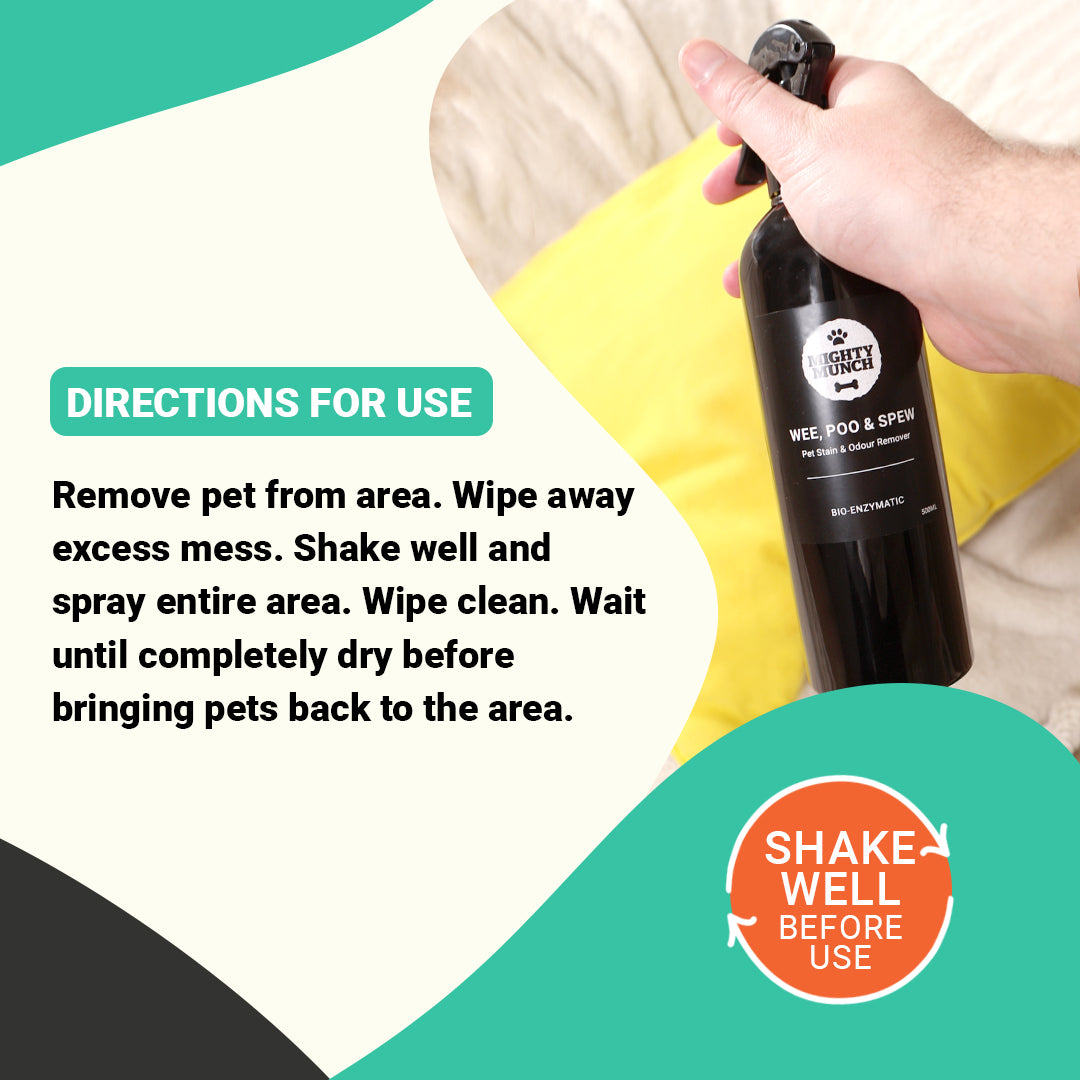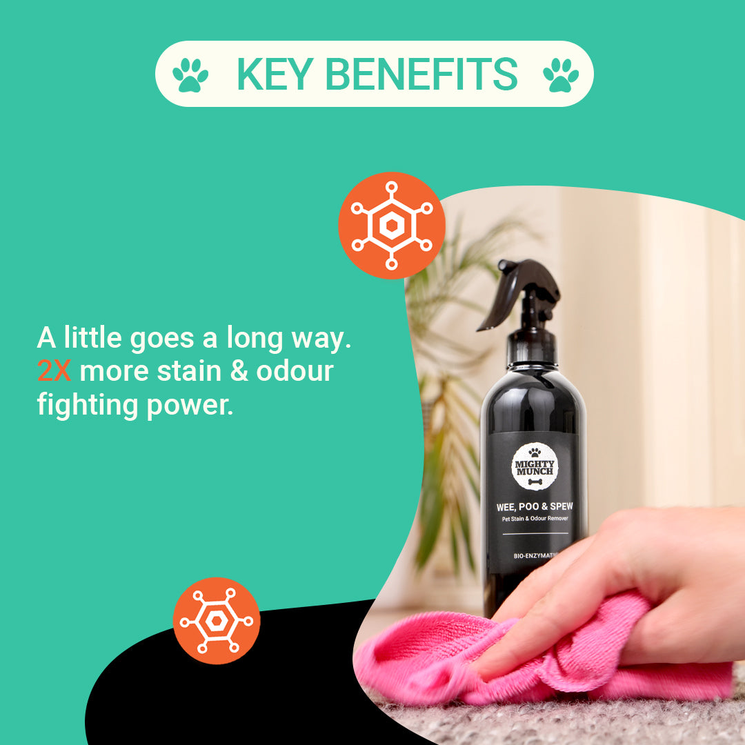 We may be used to our pet's odours, but our guests are not. Mighty Munch has developed a break-through science-based formula that targets odours & stains, eliminating them safely.
